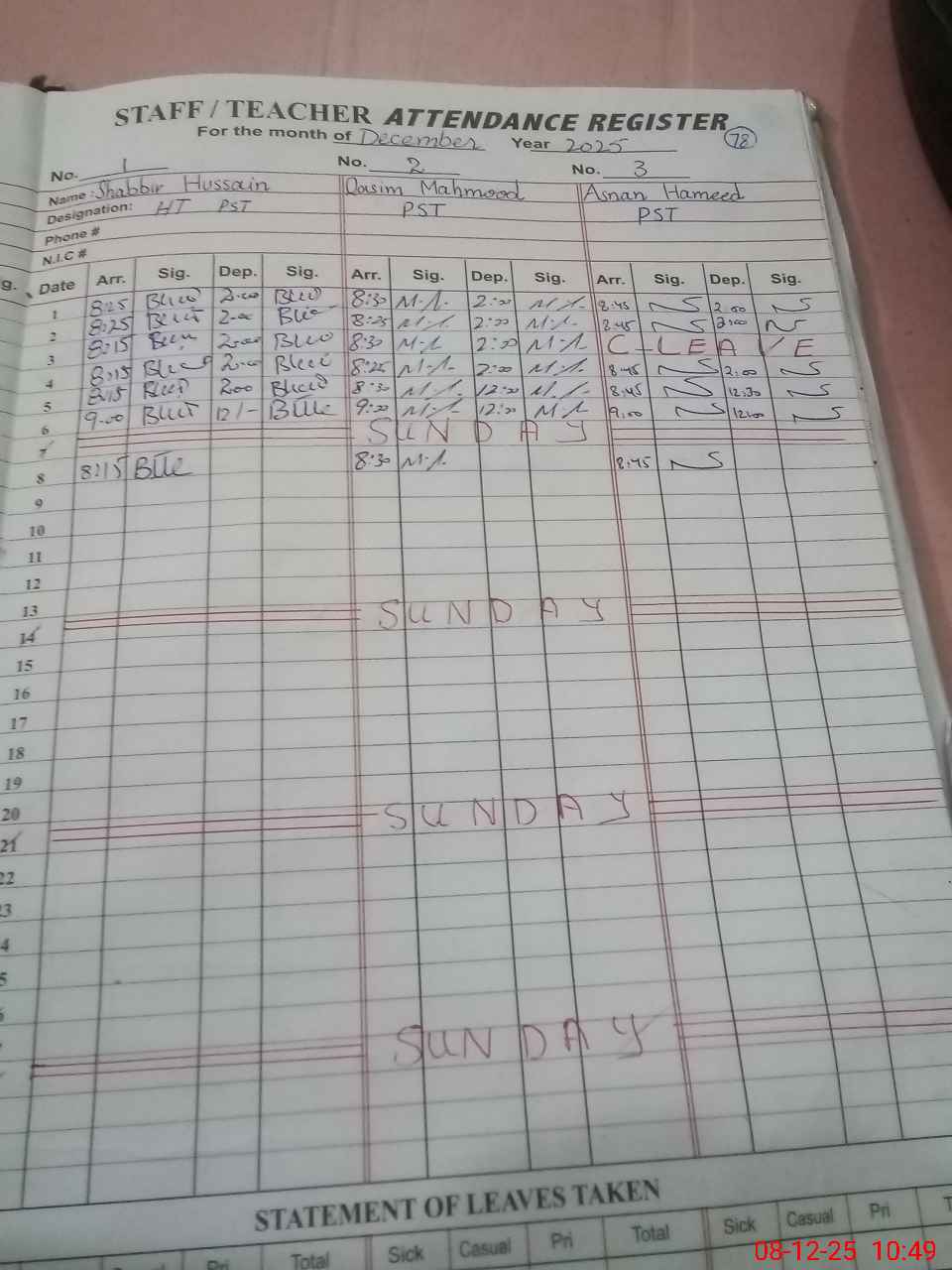 | CNIC | Full Name | Designation | R/C | Absence during last cal. month |