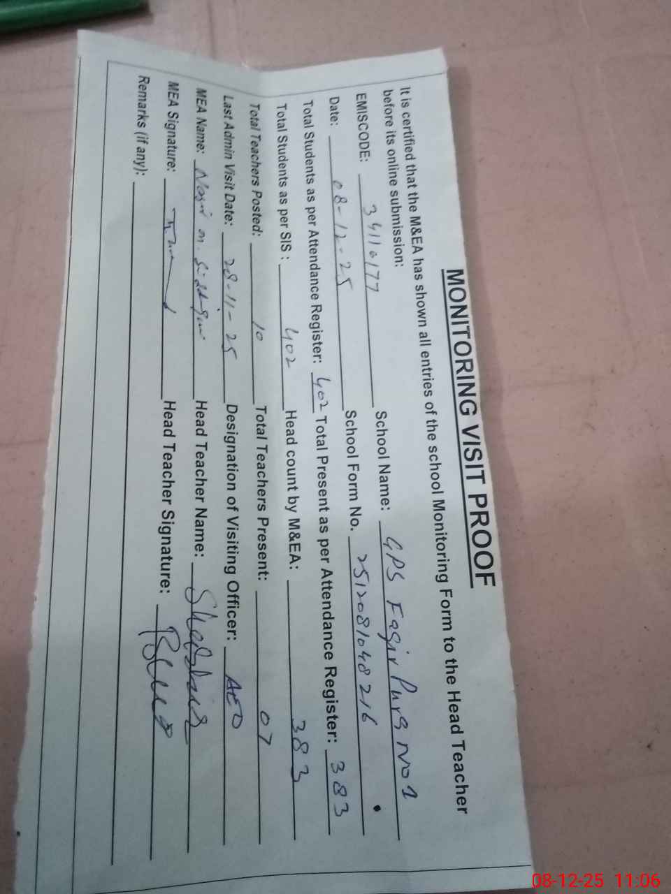 | Attendance Register | Head Teacher | MEA with School | Visit Proof |