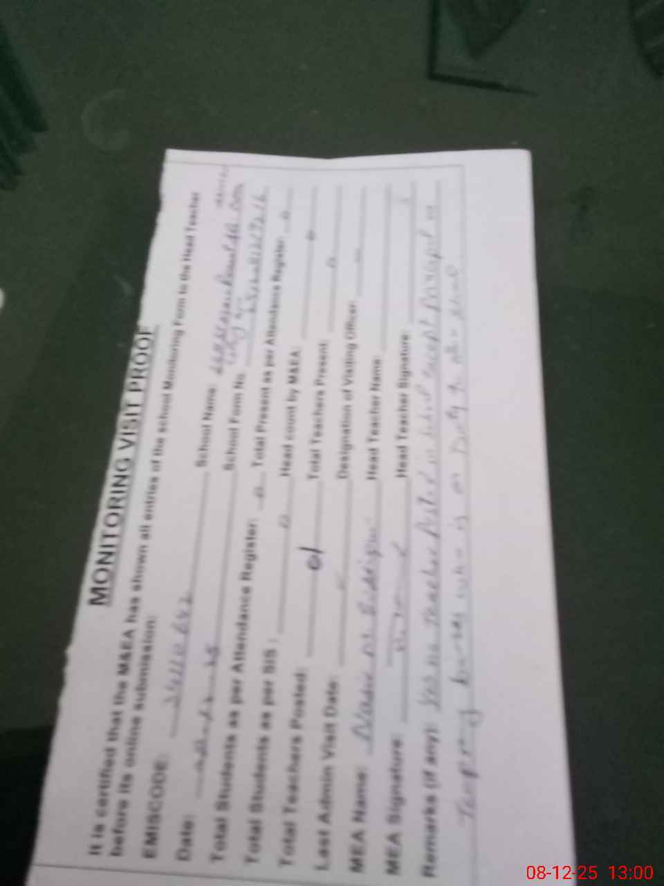 | Attendance Register | Head Teacher | MEA with School | Visit Proof |