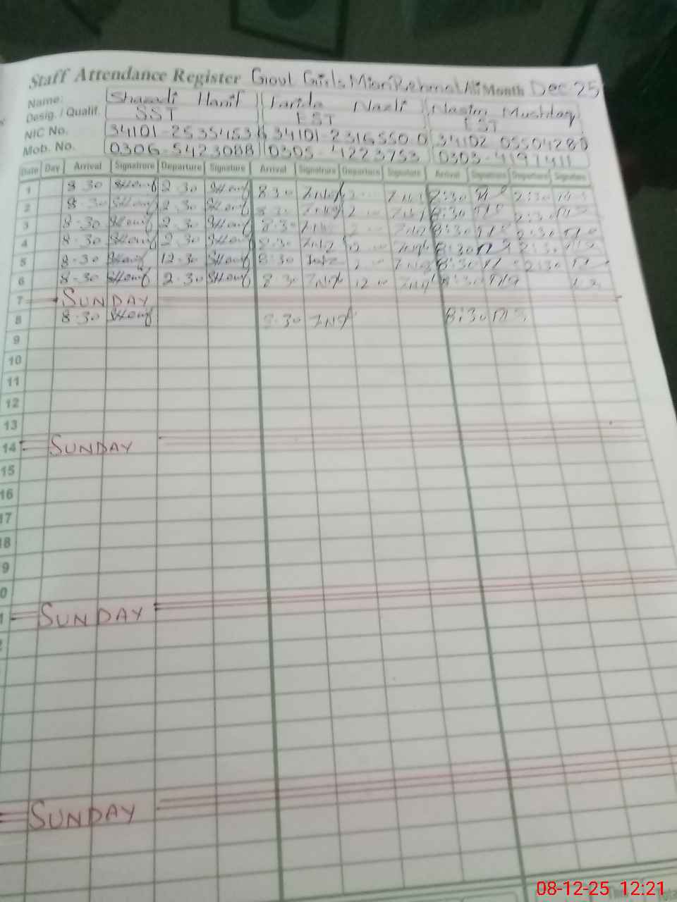 | CNIC | Full Name | Designation | R/C | Absence During Last Calender Month |