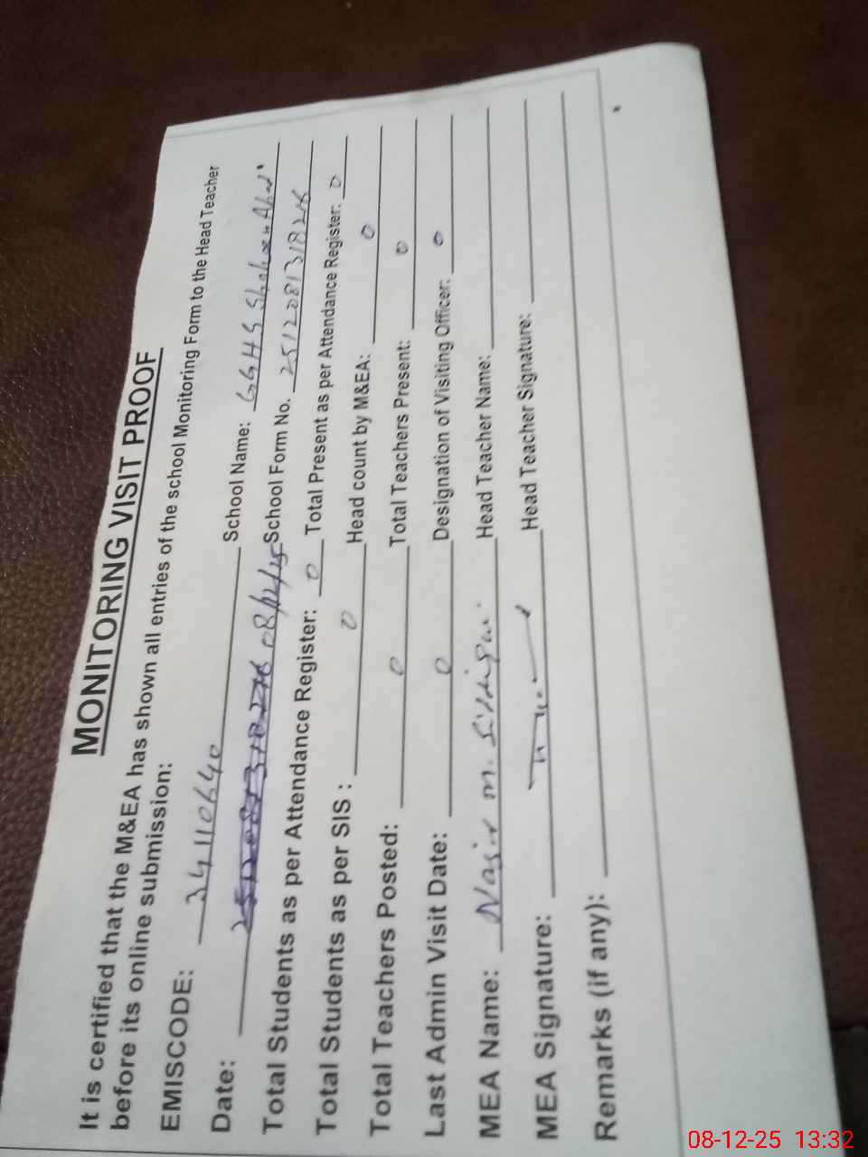 | Attendance Register | Head Teacher | MEA with School | Visit Proof |