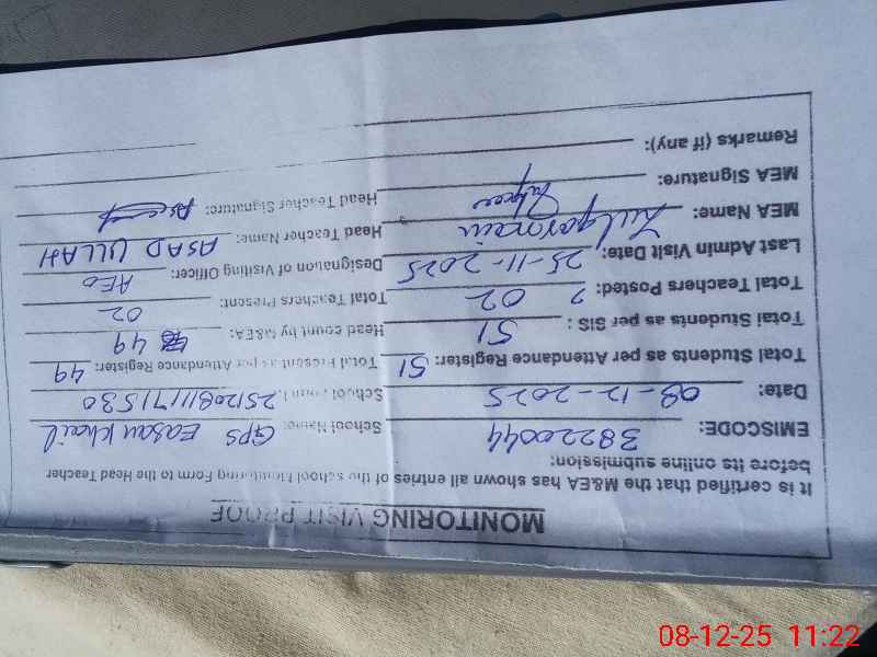 | Attendance Register | Head Teacher | MEA with School | Visit Proof |