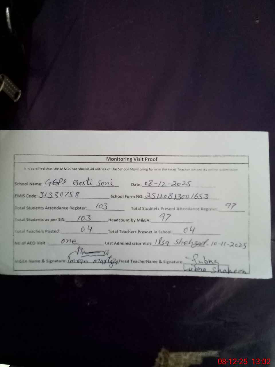 | Attendance Register | Head Teacher | MEA with School | Visit Proof |