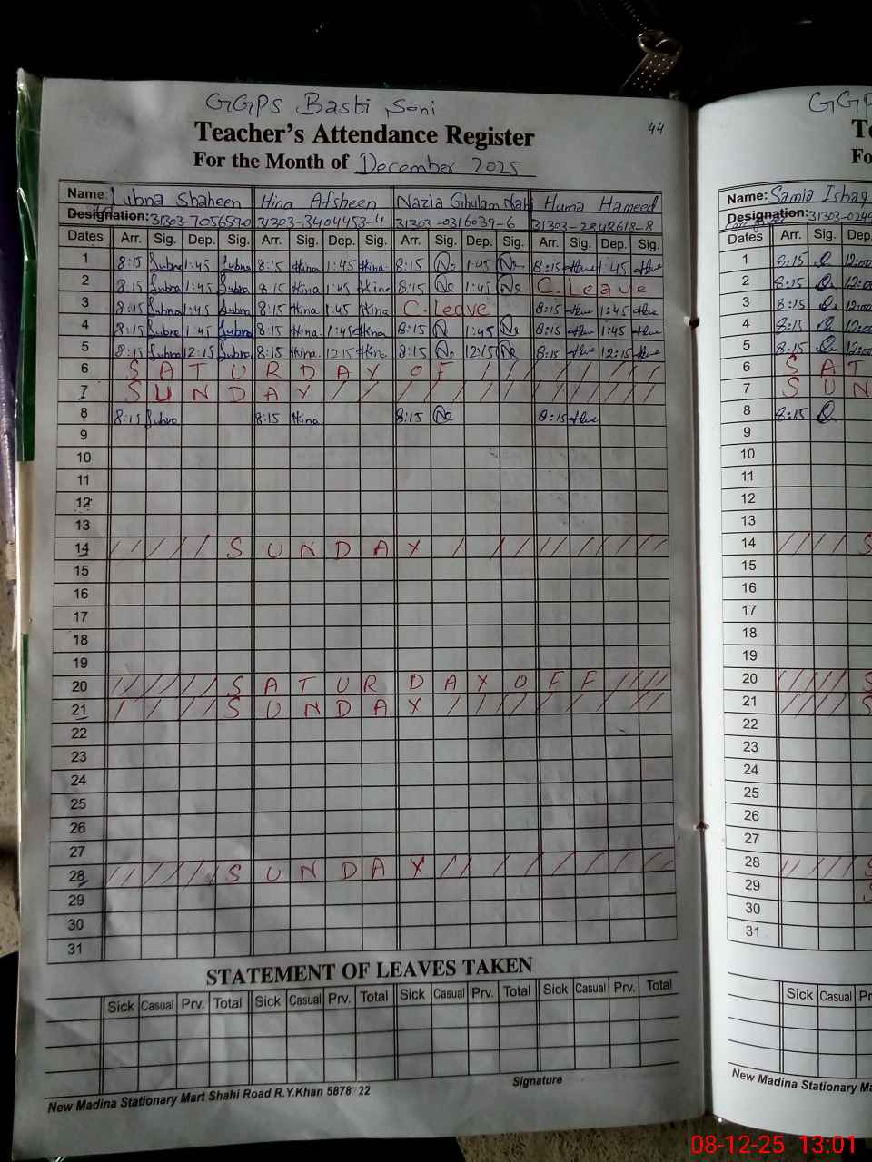| CNIC | Full Name | Designation | R/C | Absence During Last Calender Month |
