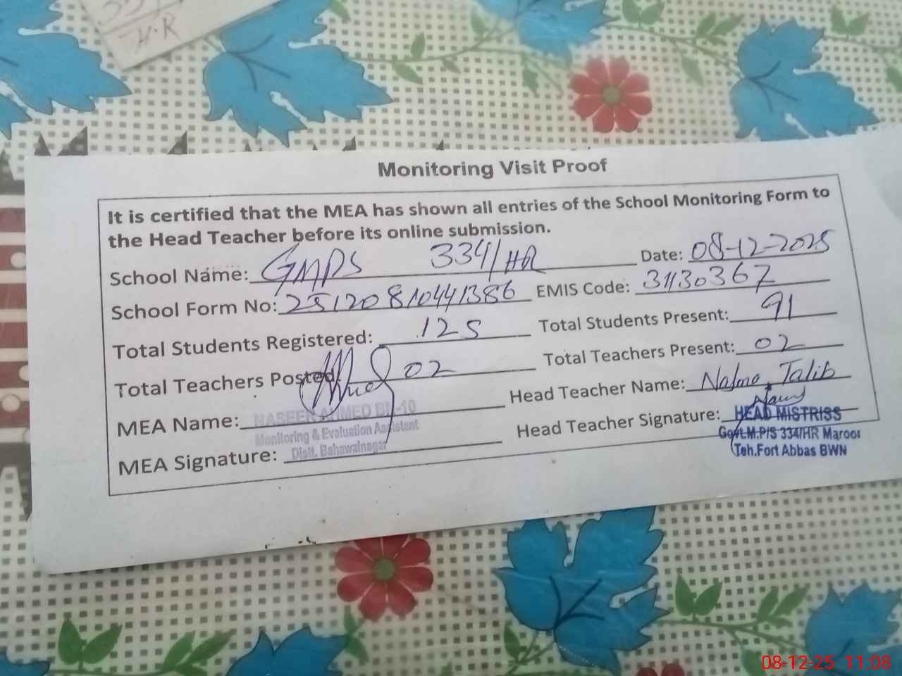 | EMIS Code: 31130367 | Name of School: GMPS CHAK NO. 334/HR | |||