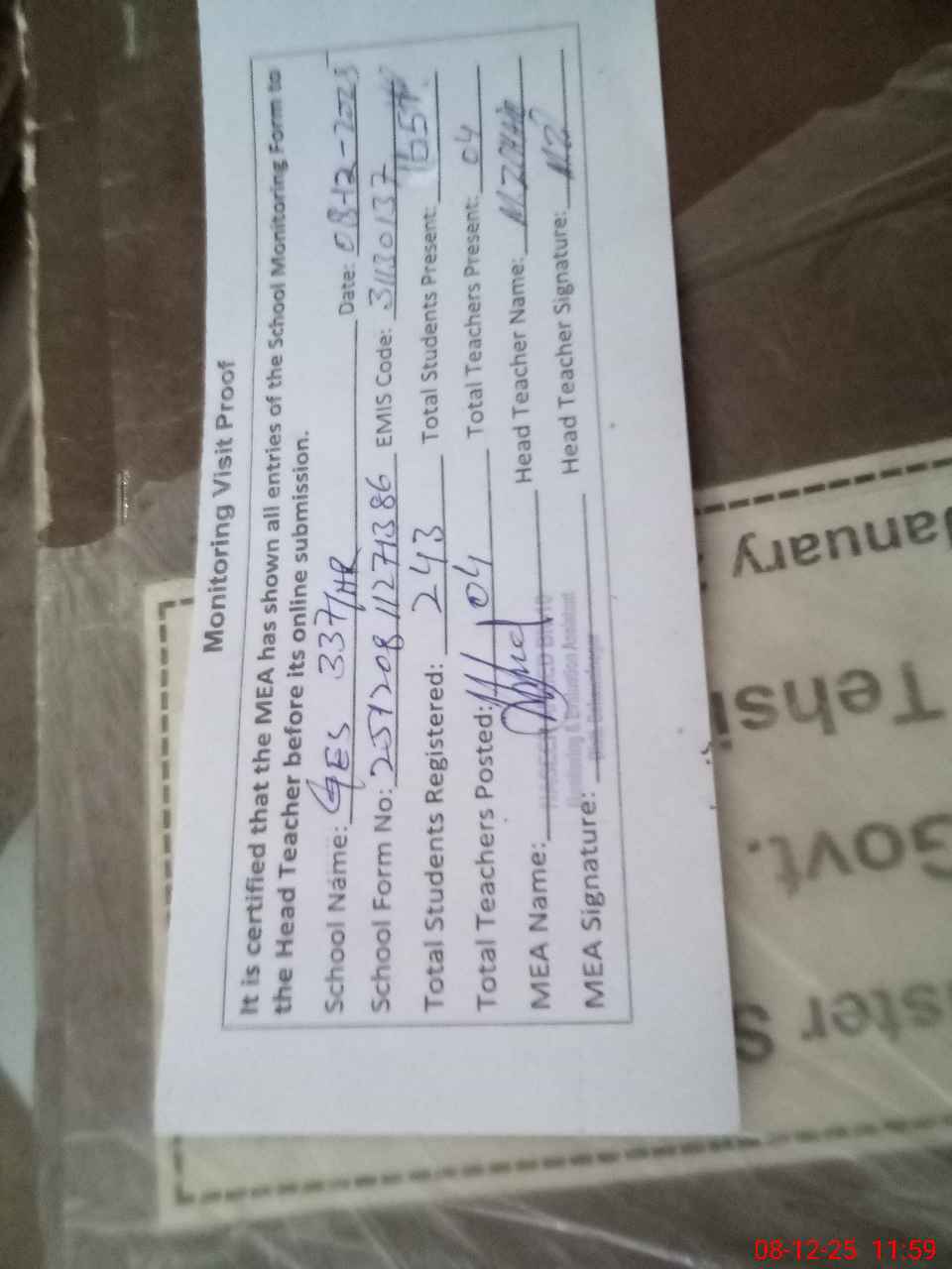 | Attendance Register | Head Teacher | MEA with School | Visit Proof |
