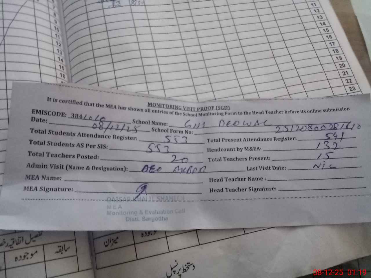 | Attendance Register | Head Teacher | MEA with School | Visit Proof |
