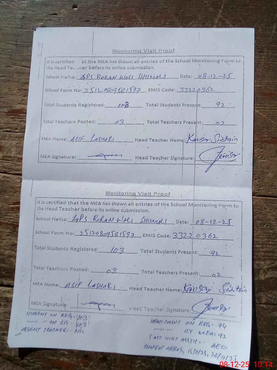 | Attendance Register | Head Teacher | MEA with School | Visit Proof |