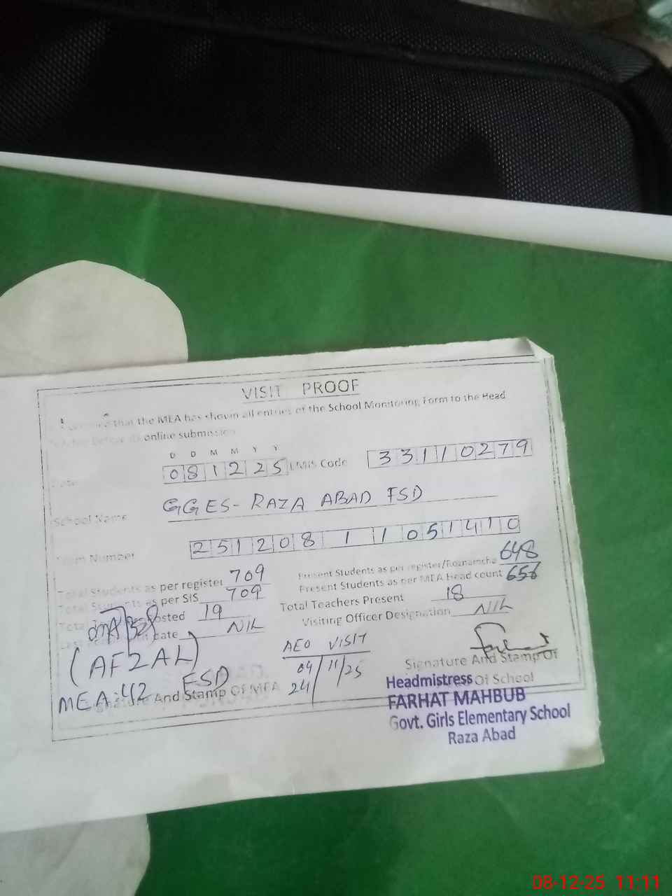 | Attendance Register | Head Teacher | MEA with School | Visit Proof |