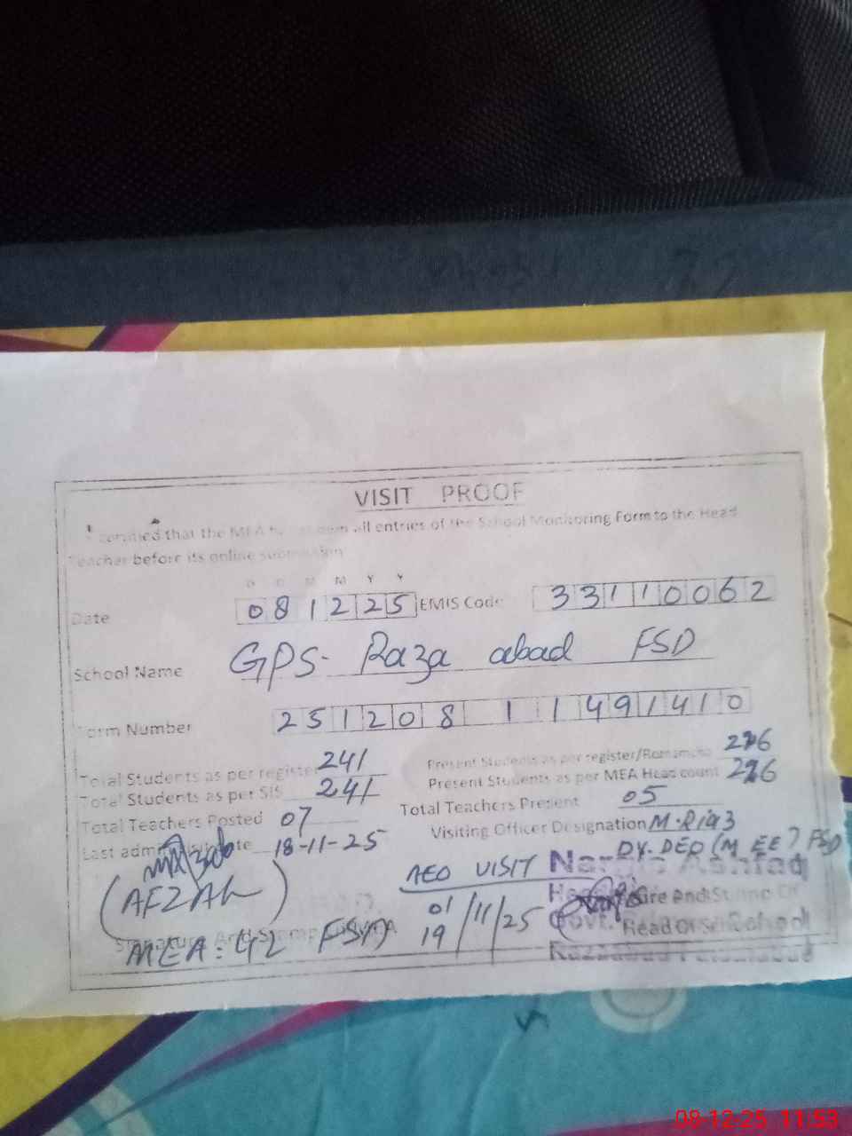 | Attendance Register | Head Teacher | MEA with School | Visit Proof |