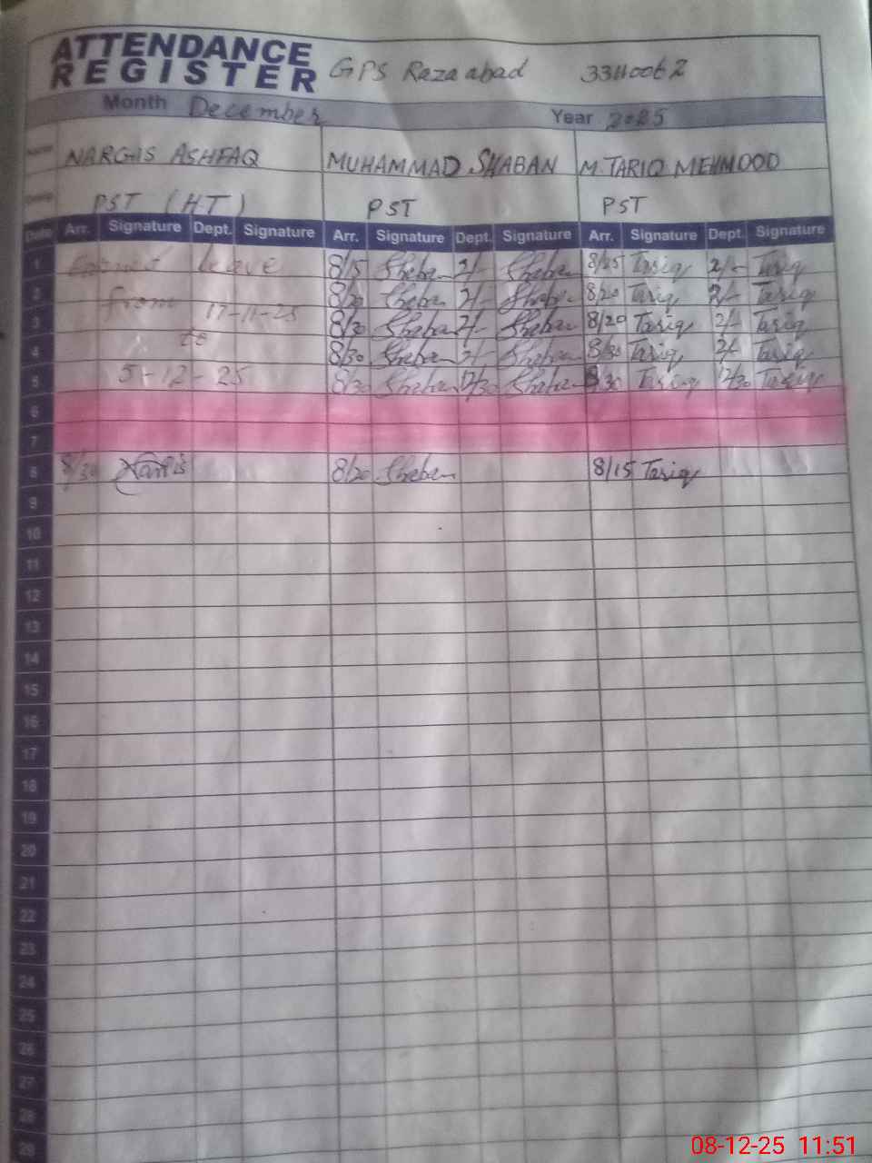 | CNIC | Full Name | Designation | R/C | Absence during last cal. month |