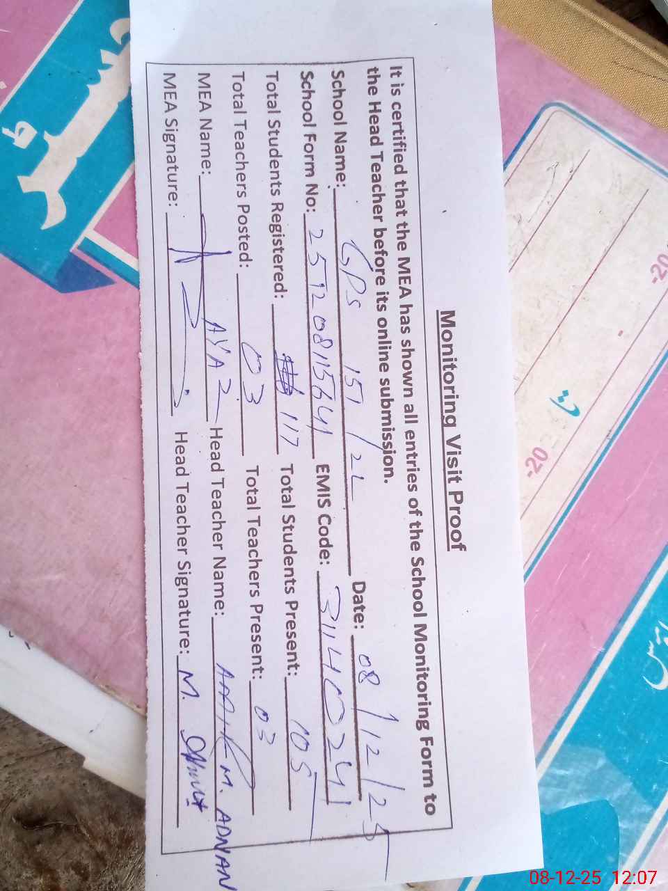 | Attendance Register | Head Teacher | MEA with School | Visit Proof |