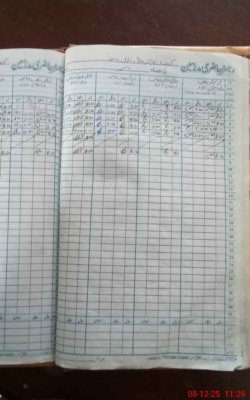 | CNIC | Full Name | Designation | R/C | Absence During Last Calender Month |