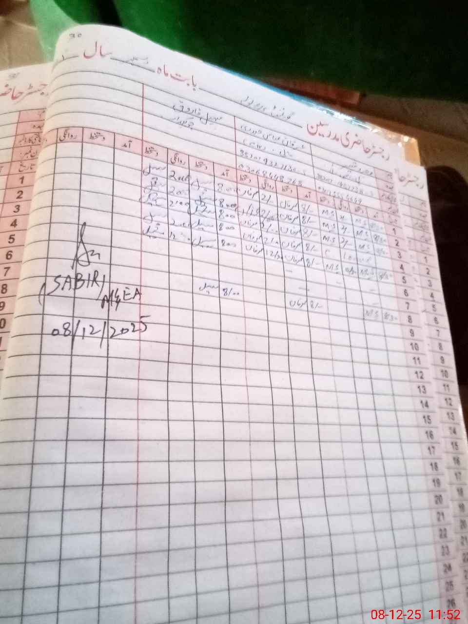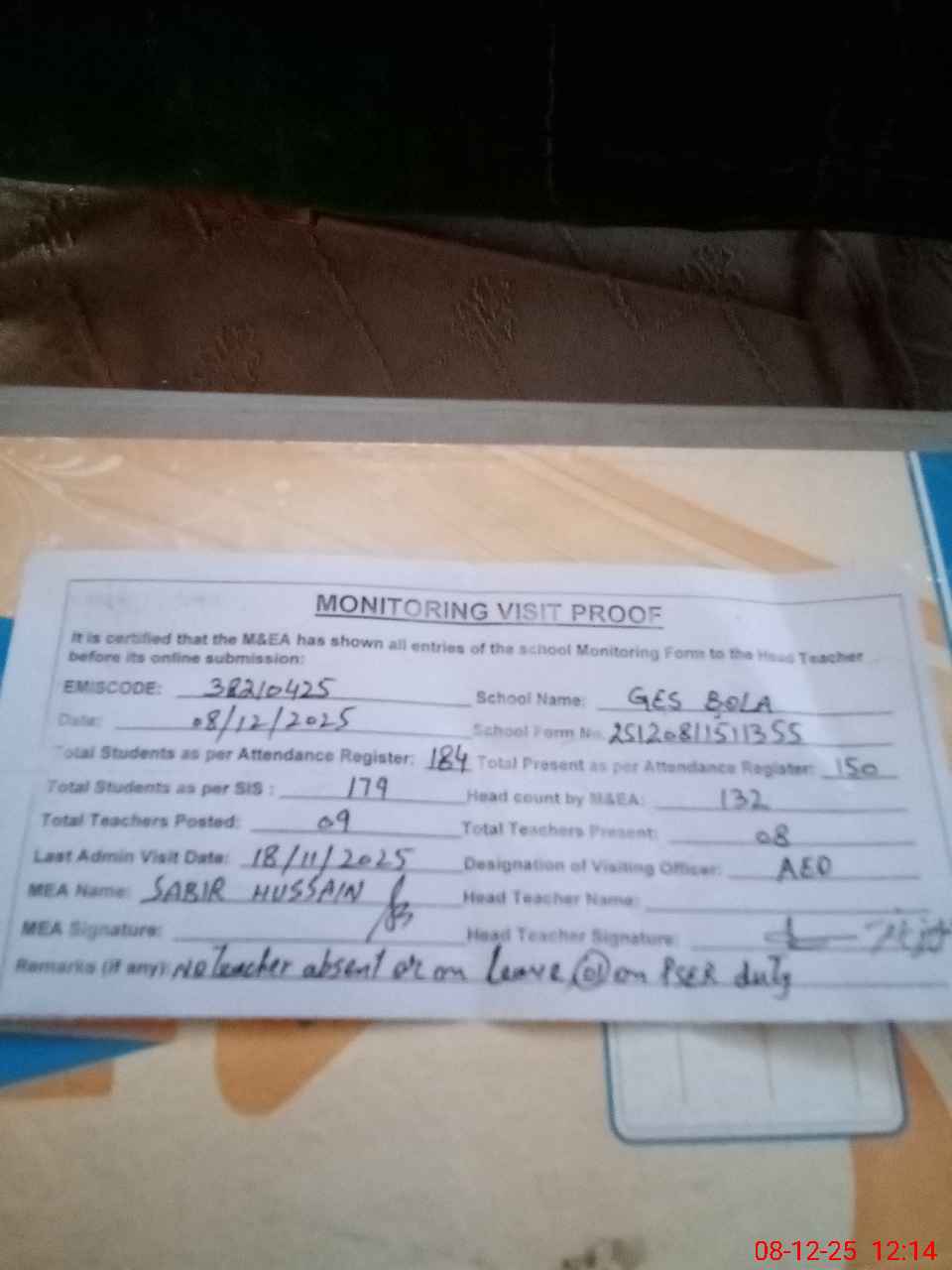 | Remarks (Use Separate Page if Required): no teacher absent total students on register 184 total students on SiS 179 present students 132 last admin visit by AEO on 18 Nov 2025 | |||||