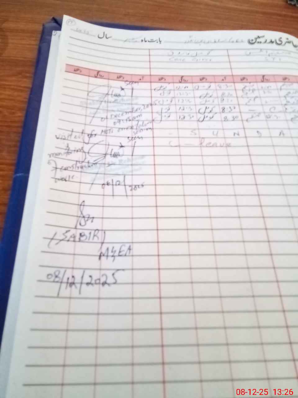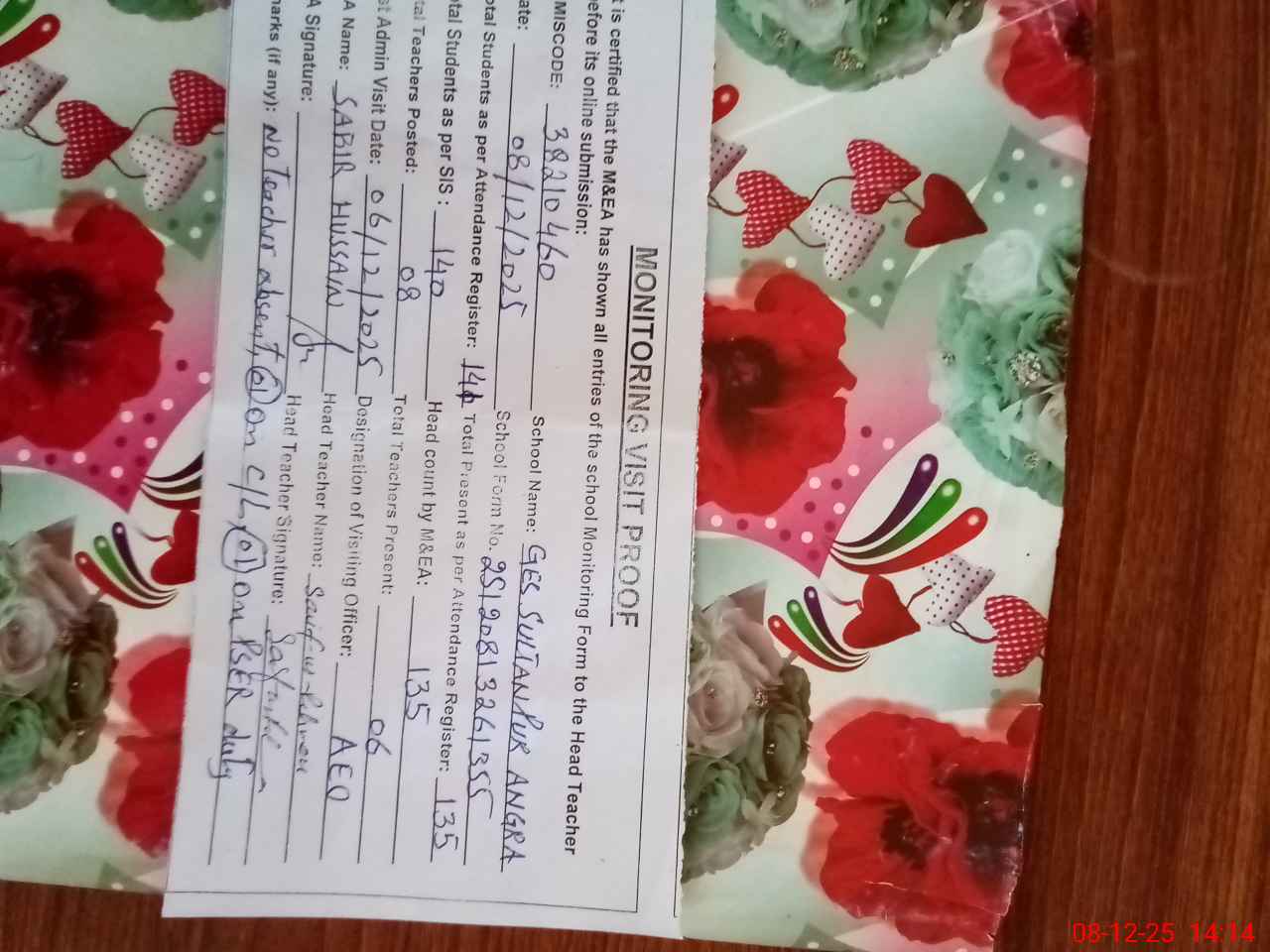 | Remarks (Use Separate Page if Required): no teacher absent total students on register 141 total students on SiS 140 present students 135 last admin visit by AEO on 06 Dec 2025 | |||||