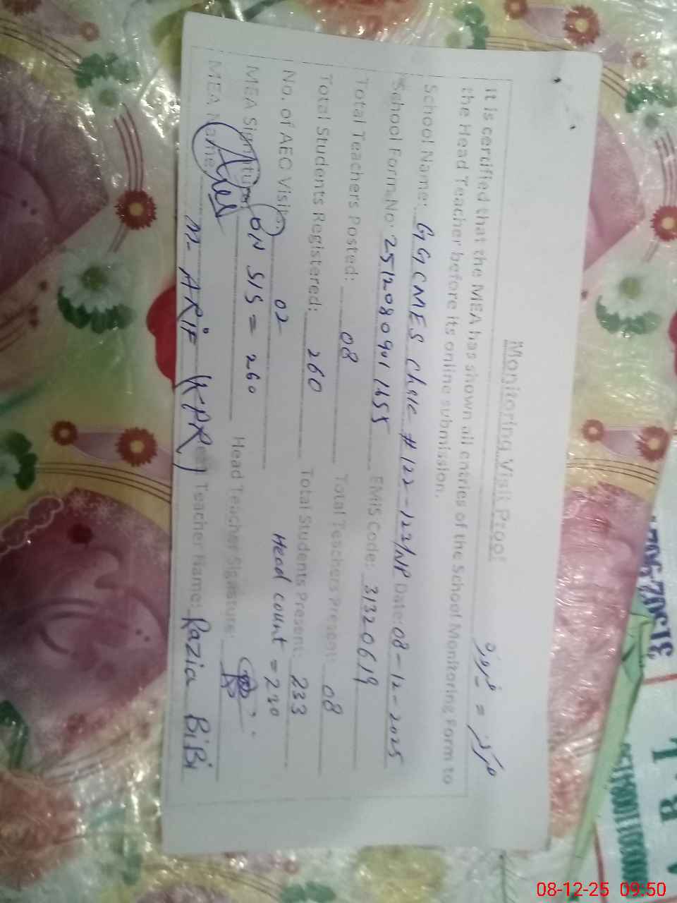 | Attendance Register | Head Teacher | MEA with School | Visit Proof |