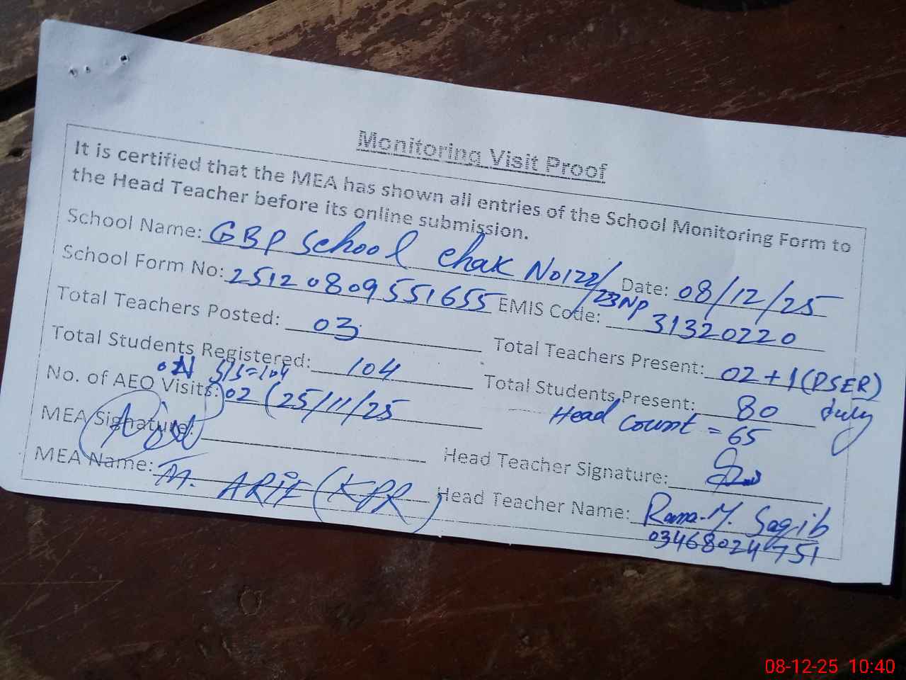 | EMIS Code: 31320220 | Name of School: GPS CHAK 122-123 NP | |||