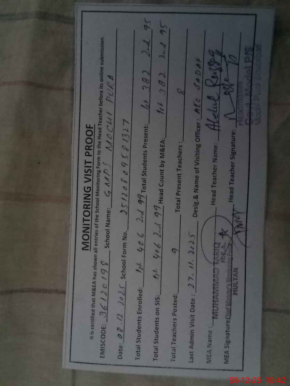 | Attendance Register | Head Teacher | MEA with School | Visit Proof |