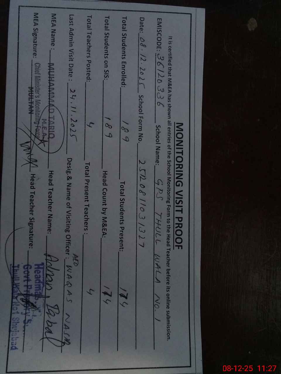 | Attendance Register | Head Teacher | MEA with School | Visit Proof |