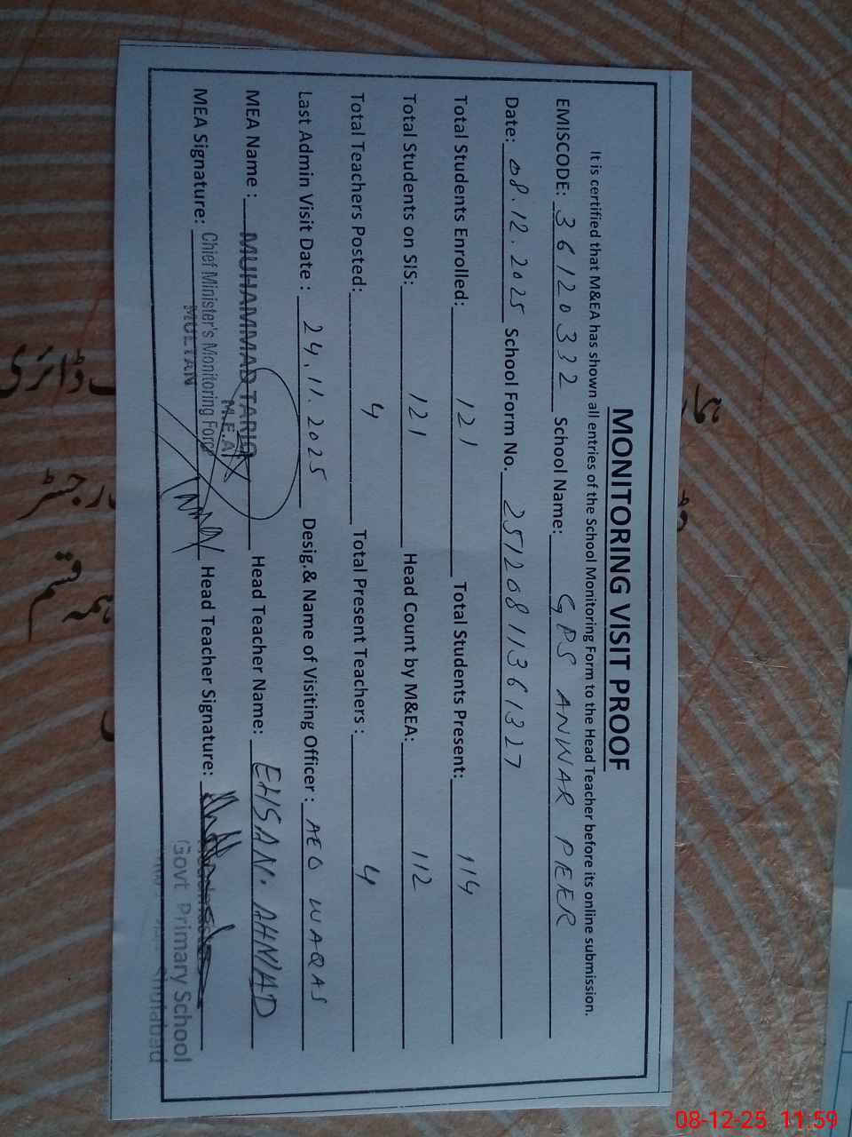 | EMIS Code: 36120332 | Name of School: GPS ANWAR PEER SHUJABAD | |||
