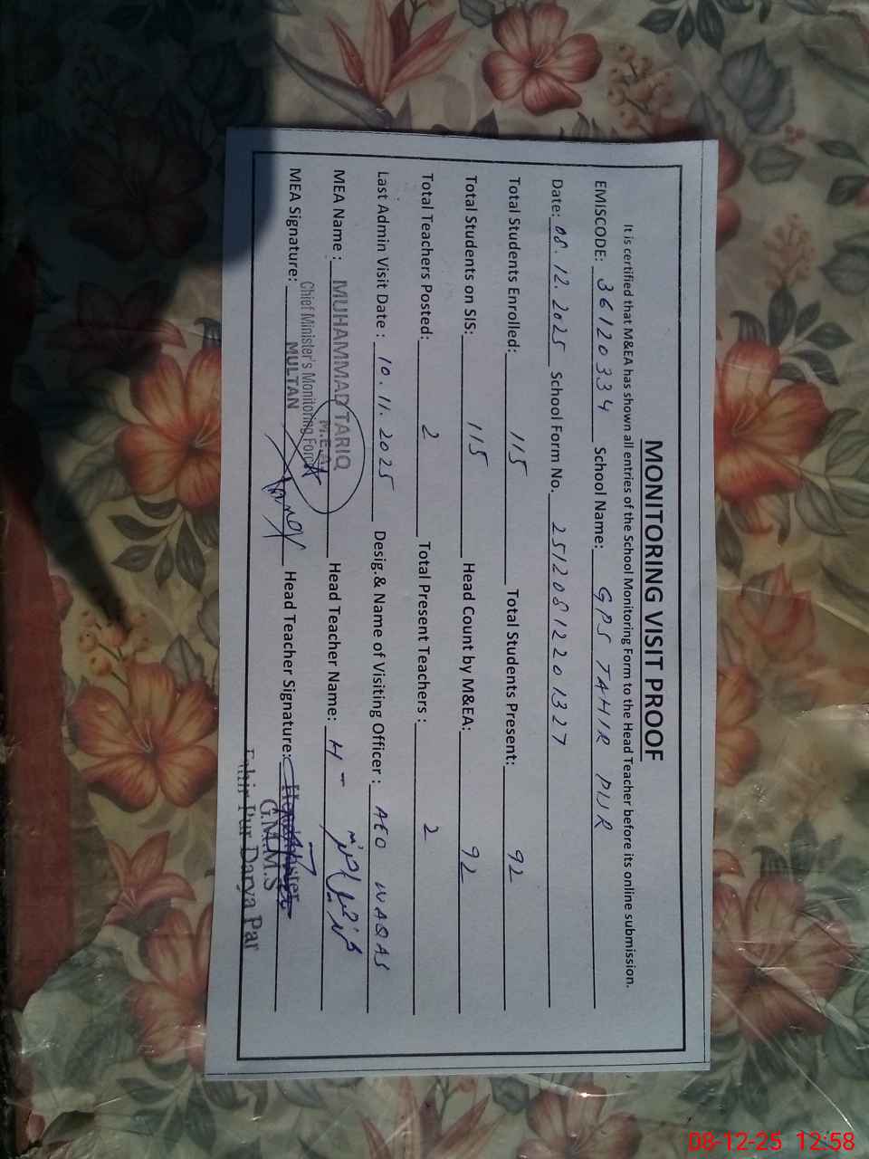 | EMIS Code: 36120334 | Name of School: GPS TAHIR PUR SHUJABAD | |||