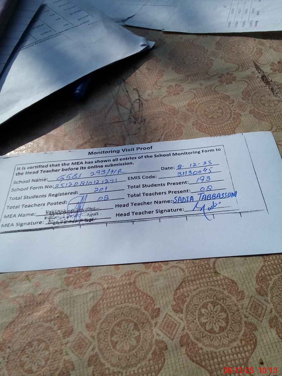 | Attendance Register | Head Teacher | MEA with School | Visit Proof |