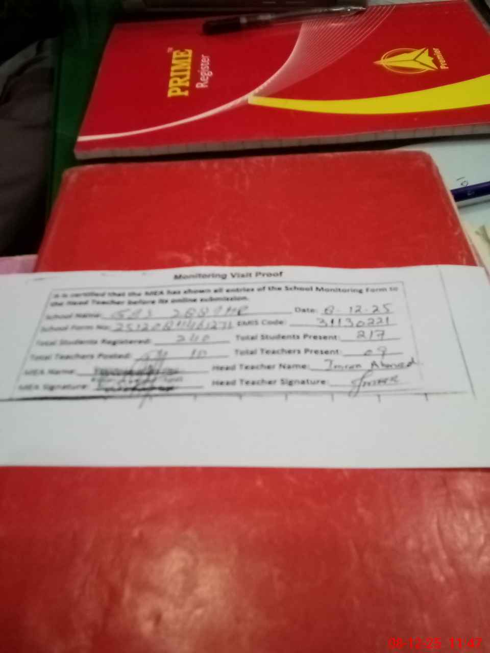 | Attendance Register | Head Teacher | MEA with School | Visit Proof |