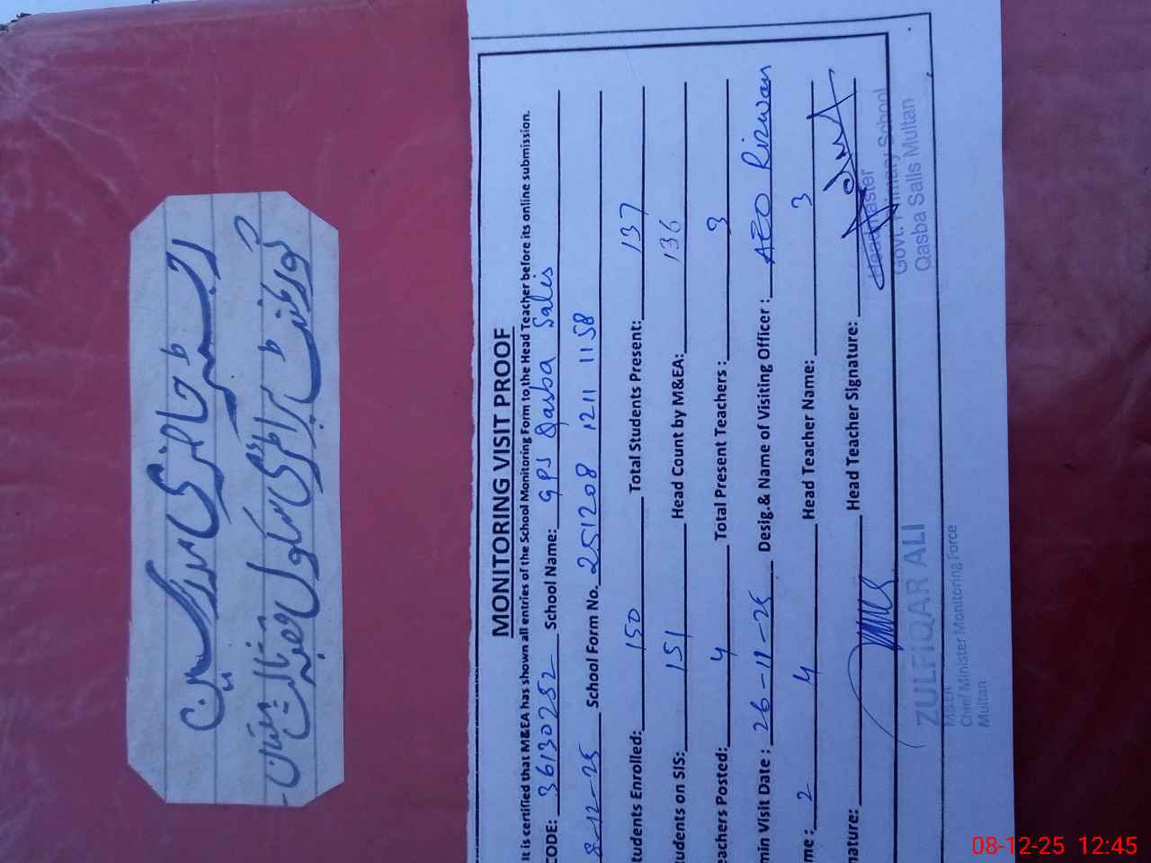 | Attendance Register | Head Teacher | MEA with School | Visit Proof |
