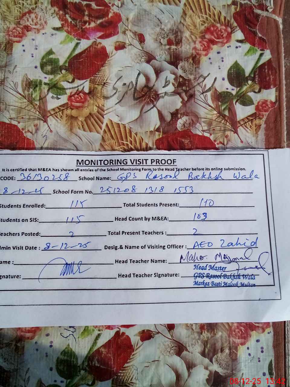 | Attendance Register | Head Teacher | MEA with School | Visit Proof |