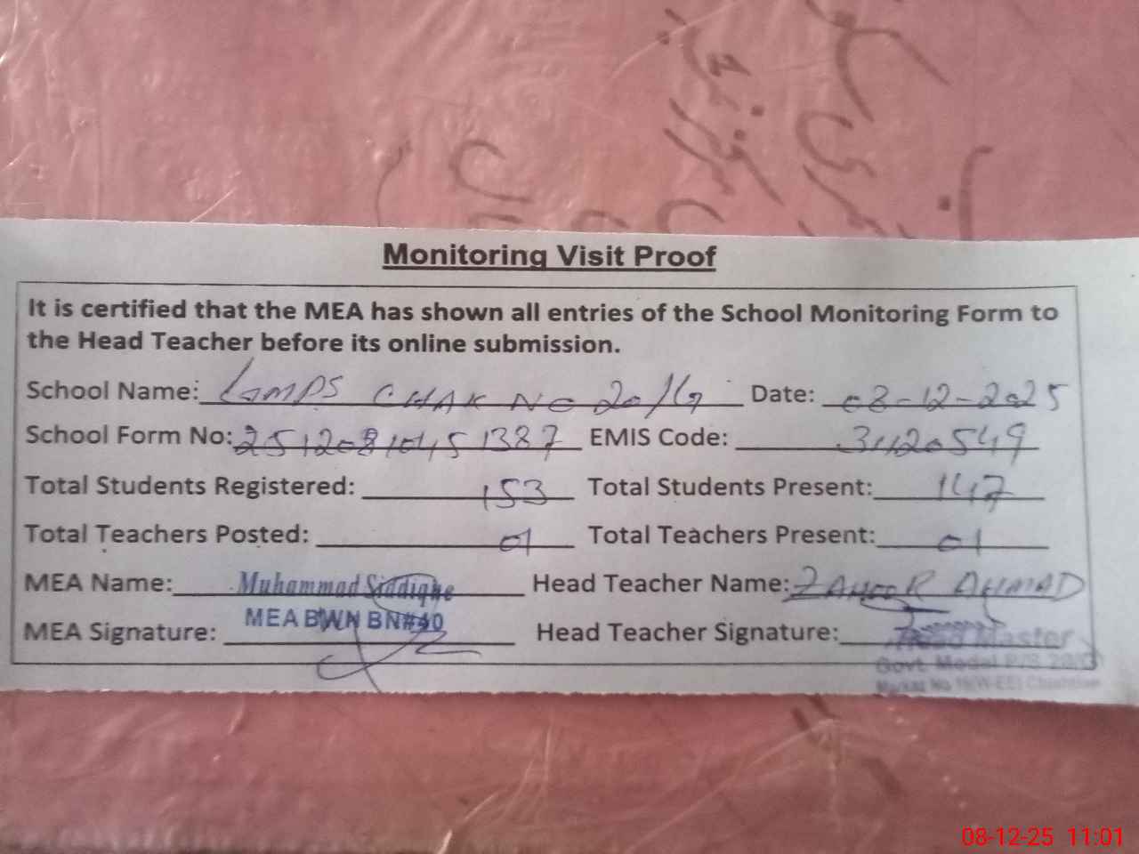 | Attendance Register | Head Teacher | MEA with School | Visit Proof |