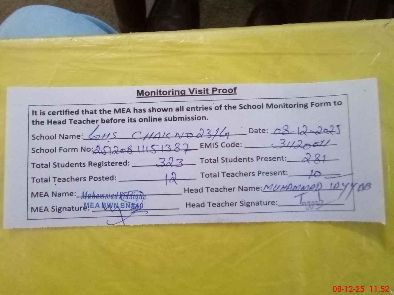 | EMIS Code: 31120011 | Name of School: GHS CHAK NO. 23/G | |||
