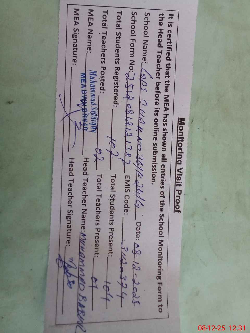 | Attendance Register | Head Teacher | MEA with School | Visit Proof |