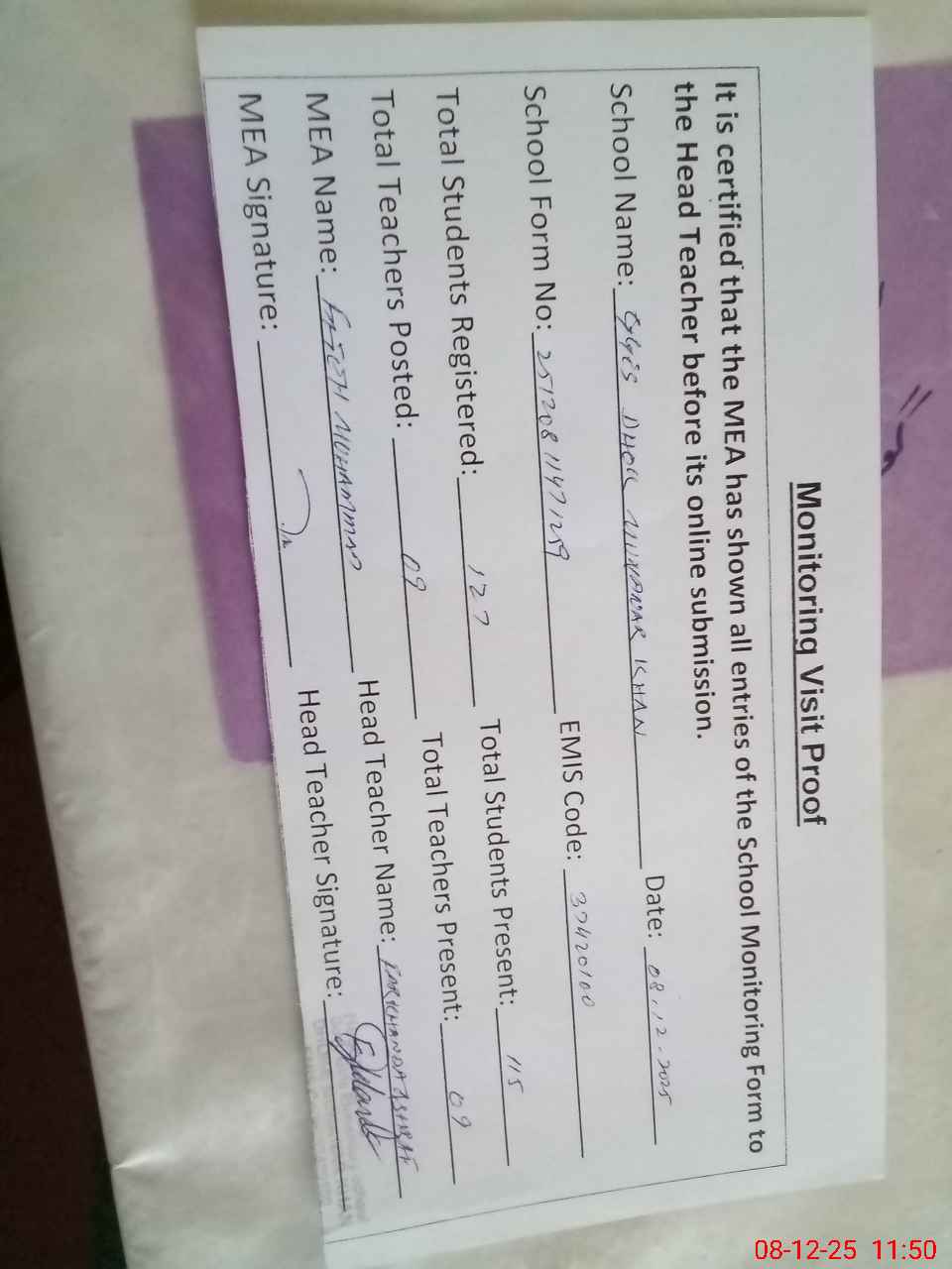 | Attendance Register | Head Teacher | MEA with School | Visit Proof |