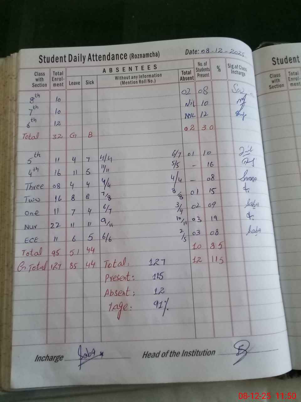 | Total Students Present | 0 | 8 | 10 | 15 | 8 | 16 | 10 | 12 | 10 | 7 | 115 | |||||
