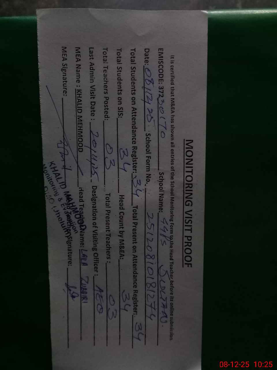 | Attendance Register | Head Teacher | MEA with School | Visit Proof |