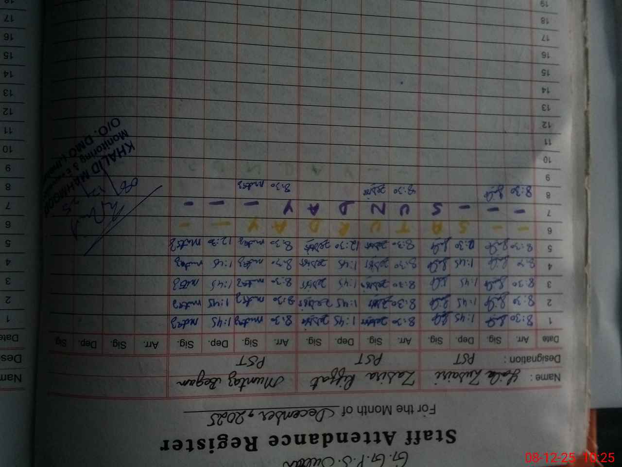 | CNIC | Full Name | Designation | R/C | Absence during last cal. month |