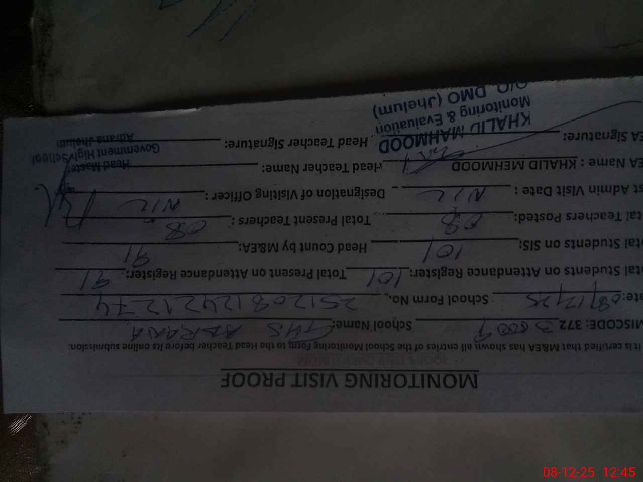 | Attendance Register | Head Teacher | MEA with School | Visit Proof |