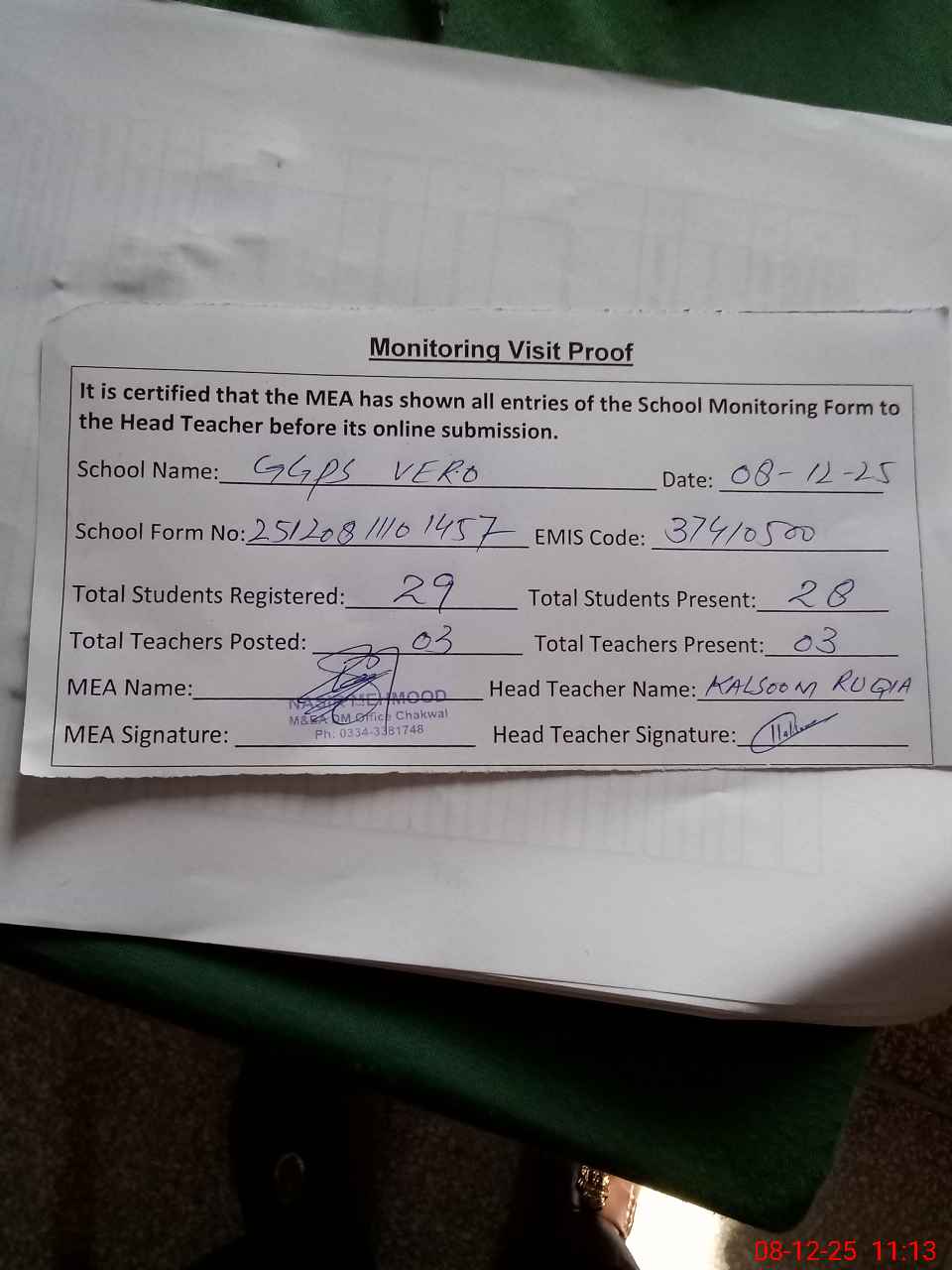 | Attendance Register | Head Teacher | MEA with School | Visit Proof |