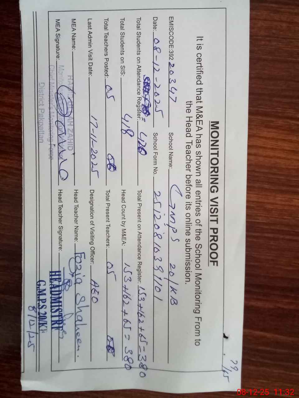| Attendance Register | Head Teacher | MEA with School | Visit Proof |
