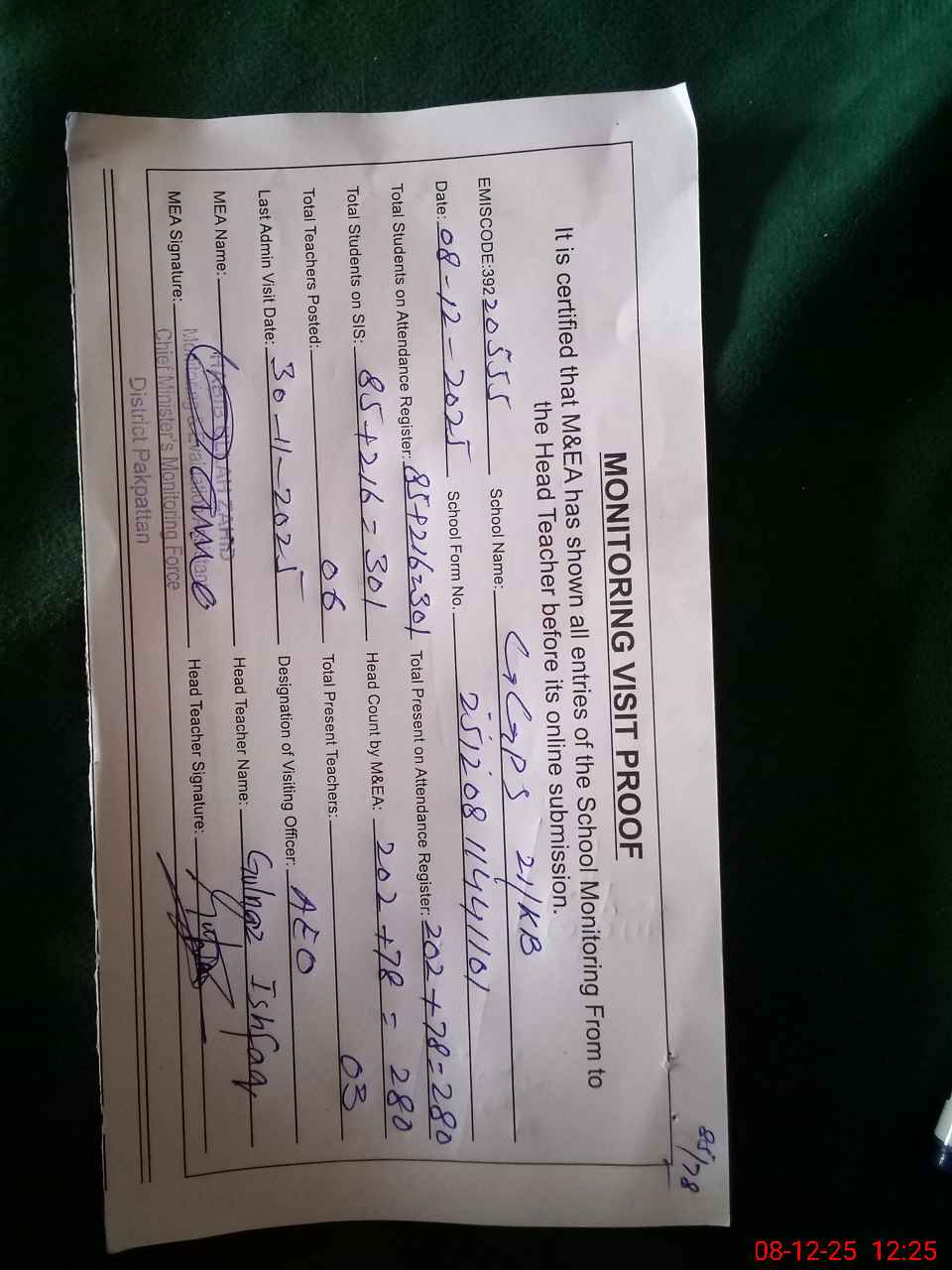 | Name: GU**** IS**** Designation: (School Headmaster's/Headmistress's) PST Phone/Cell Number: 03**** |