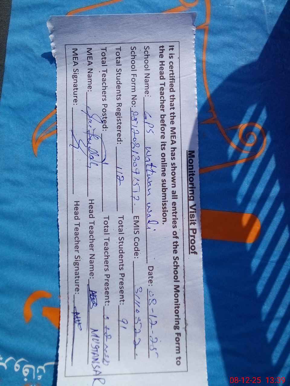 | EMIS Code: 31110522 | Name of School: GPS WATTWAN WALI EAST | |||
