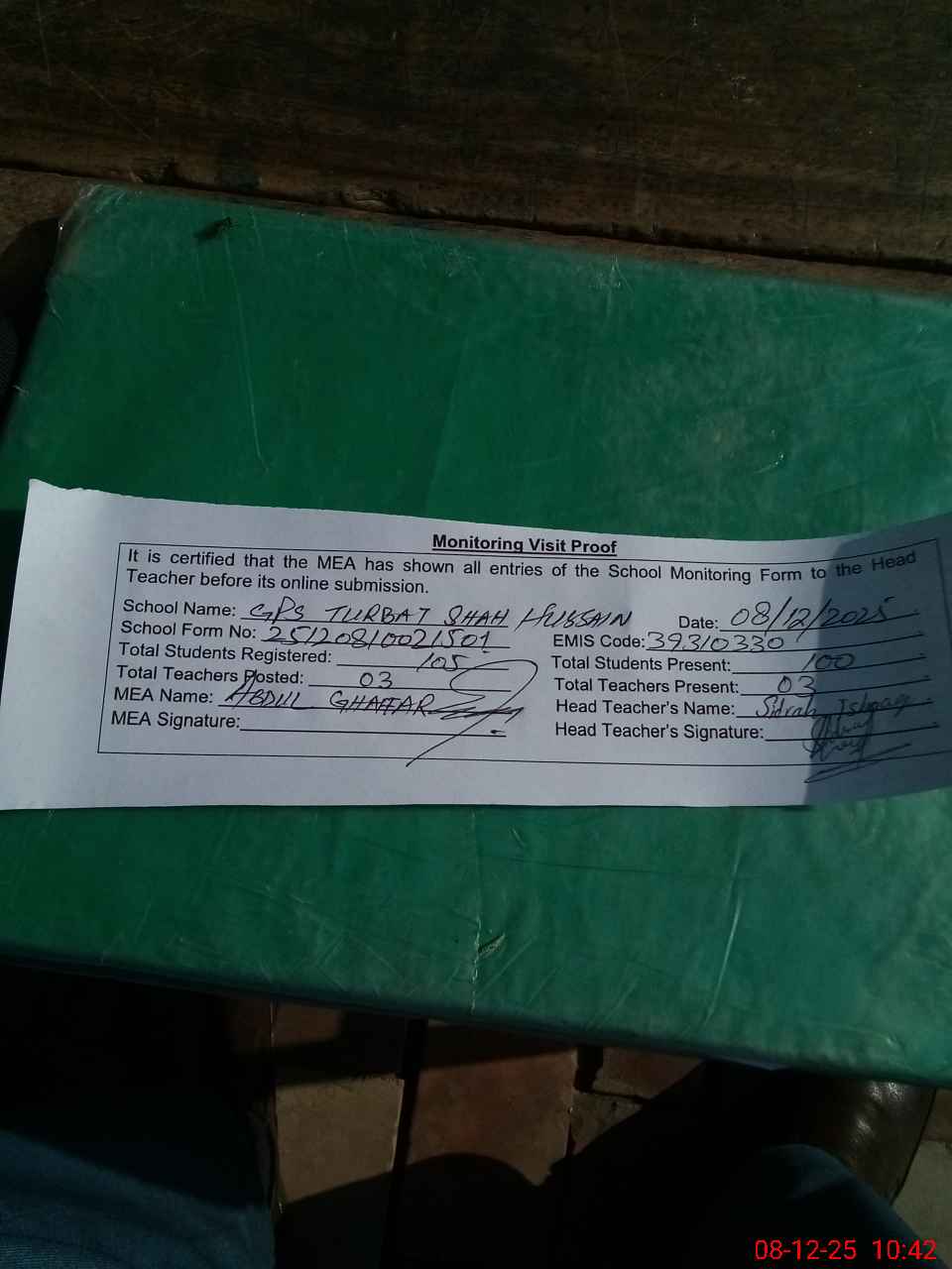 | Attendance Register | Head Teacher | MEA with School | Visit Proof |
