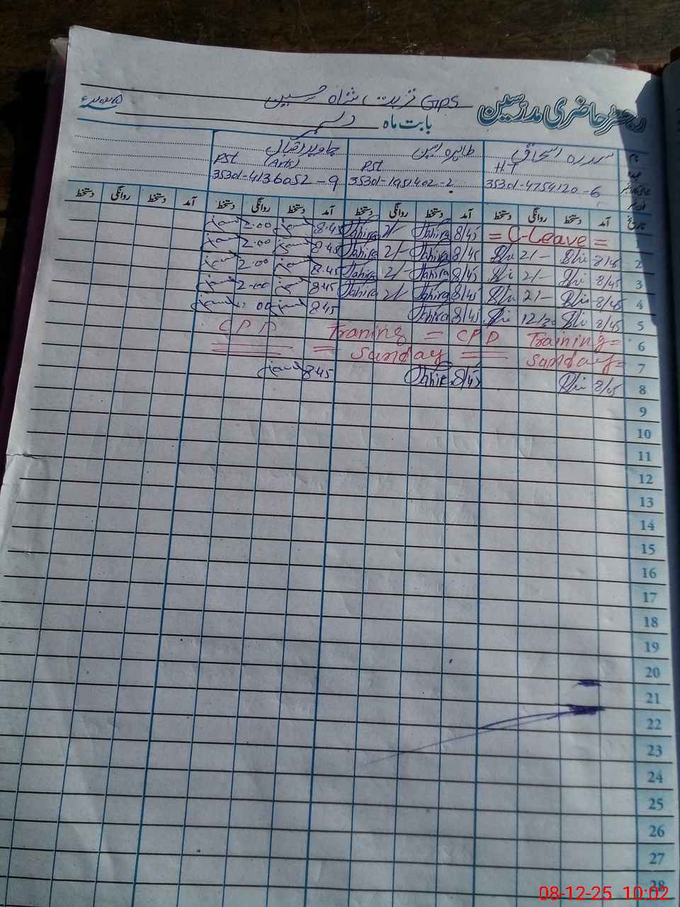| CNIC | Full Name | Designation | R/C | Absence during last cal. month |