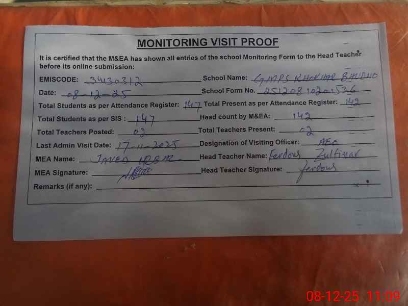 | Attendance Register | Head Teacher | MEA with School | Visit Proof |