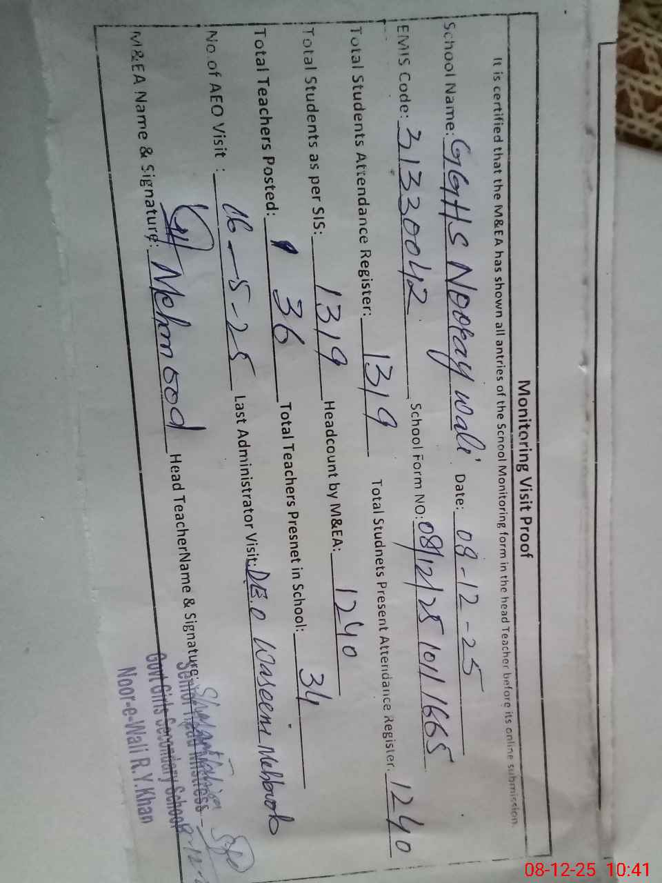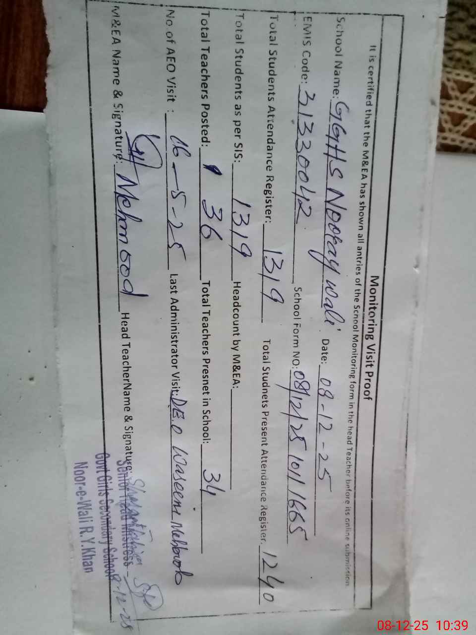 | EMIS Code: 31330042 | Name of School: GGHS NOORAY WALI | |||