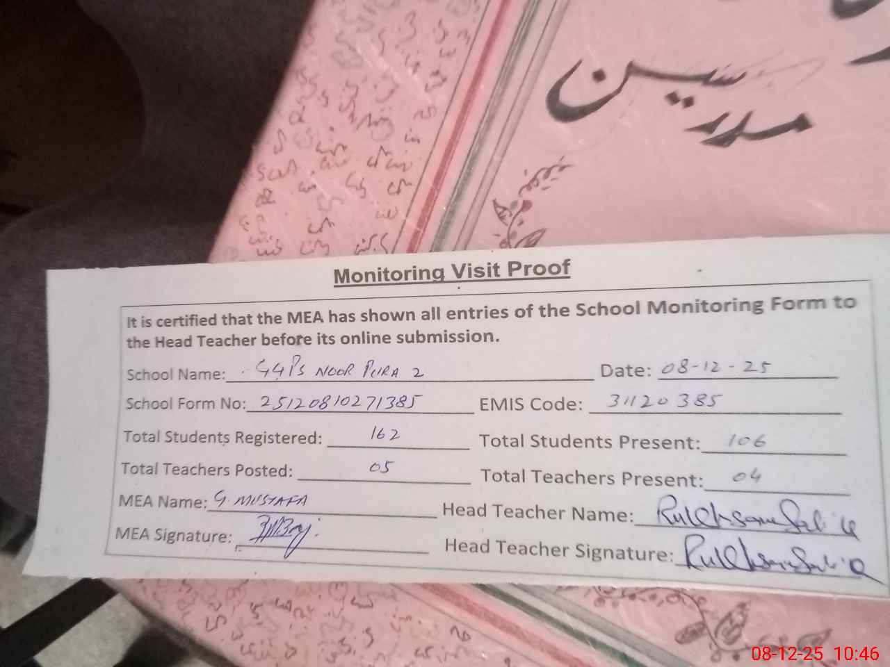 | Attendance Register | Head Teacher | MEA with School | Visit Proof |