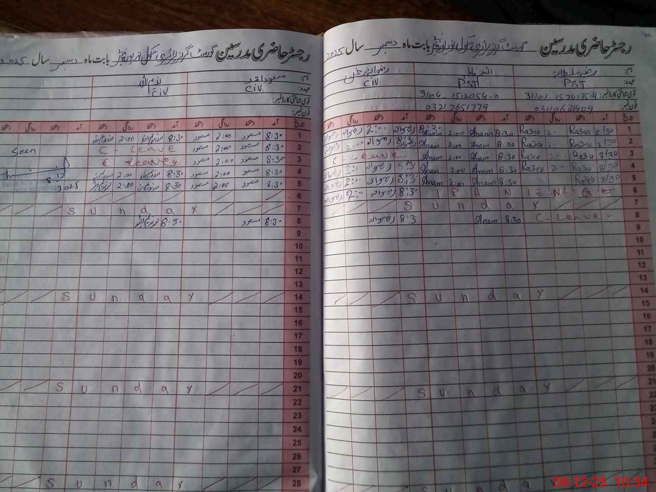 | CNIC | Full Name | Designation | R/C | Absence During Last Calender Month |