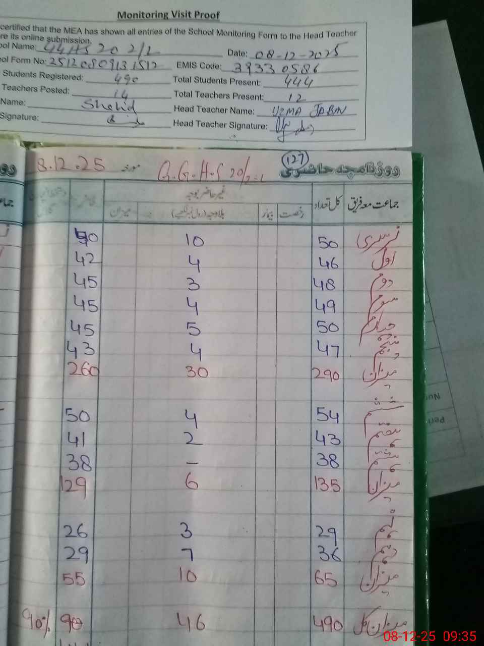 | Attendance Register | Head Teacher | MEA with School | Visit Proof |