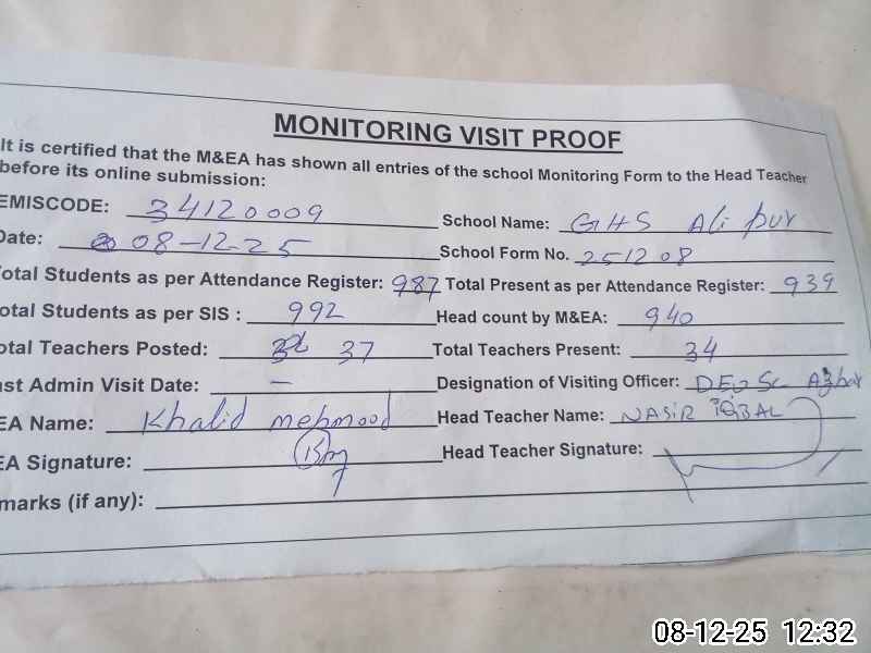 | EMIS Code: 34120009 | Name of School: GHS ALI PUR CHATHA | |||