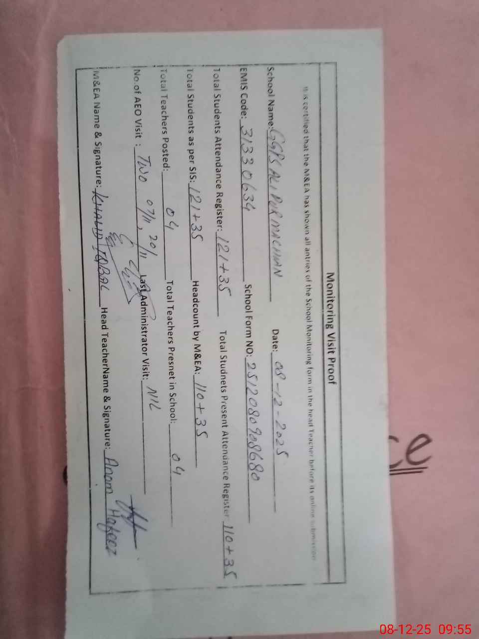 | Attendance Register | Head Teacher | MEA with School | Visit Proof |